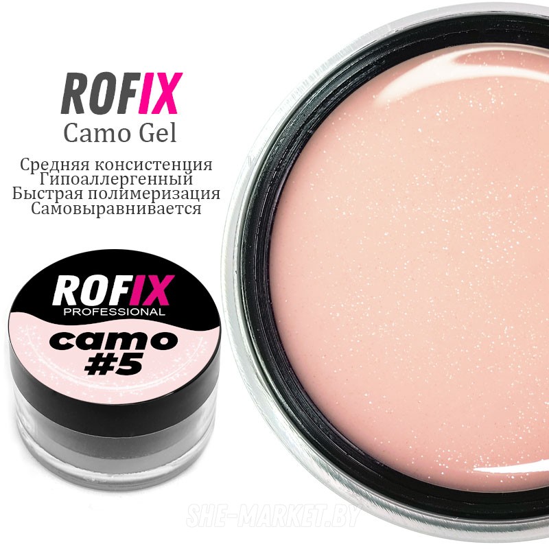 Rofix Camo - Однофазный, моделирующий, гипоаллергенный гель средней консистенции• Тиксотропный гель, позволяет не растекаться до момента его использования.• Отлично самовыравнивается• Камуфляжные оттенки под натуральный ноготь• Быстроя полимеризация 30-60сек• Используется в технике "без опила"• Подходит для укрепления, наращивания, коррекции и ремонта ногтей • Подходит как для моделирования на верхние и нижние формы, так и для укрепления ногтевой пластины.* Идеально подойдет для обучения молодых мастеров. Выбор многих обучающих nail-центров