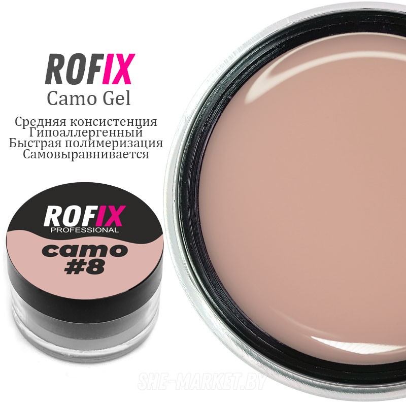 Rofix Camo - Однофазный, моделирующий, гипоаллергенный гель средней консистенции• Тиксотропный гель, позволяет не растекаться до момента его использования.• Отлично самовыравнивается• Камуфляжные оттенки под натуральный ноготь• Быстроя полимеризация 30-60сек• Используется в технике "без опила"• Подходит для укрепления, наращивания, коррекции и ремонта ногтей • Подходит как для моделирования на верхние и нижние формы, так и для укрепления ногтевой пластины.* Идеально подойдет для обучения молодых мастеров. Выбор многих обучающих nail-центров