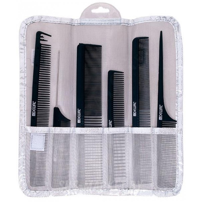 Набор расчесок DEWAL в серебристом чехле на липучке.В набор вошли 6 различных расчесок.Расчески изготовлены из высококачественной пластмассы с добавлением карбона и антистатическим покрытием.