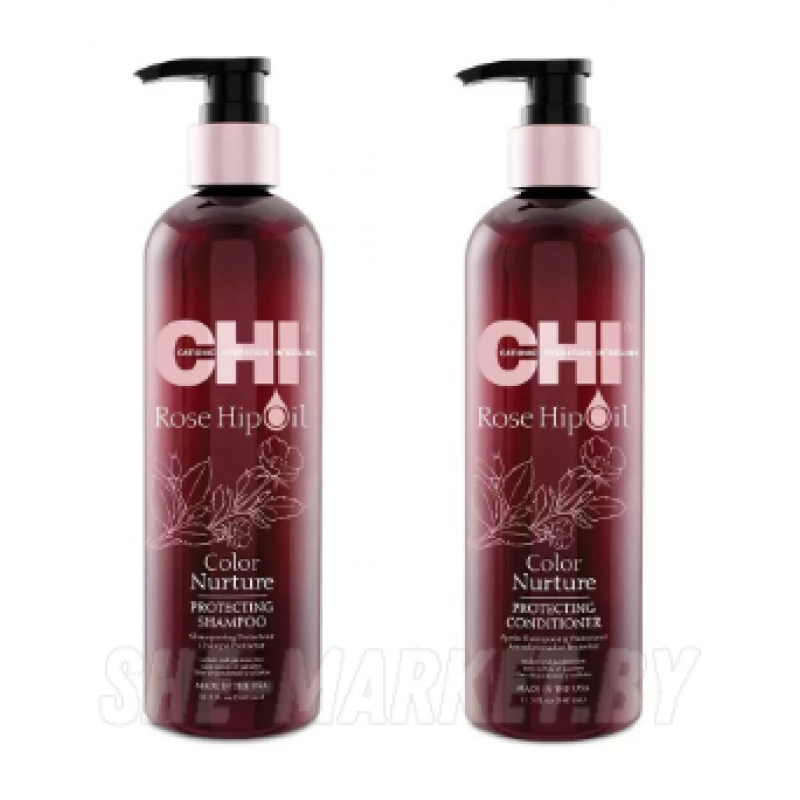 Состав набора:1. Кондиционер для защиты цвета CHI Rose Hip Oil Protecting Conditioner 340 мл:Обеспечивает надежную защиту цвета волос, облегчает расчесывание и укладку волос, придает волосам естественный блеск, обеспечивает надежную термозащиту при работе с термоинструментами.2. Шампунь без сульфатов для окрашенных волос CHI Rose Hip Oil Protecting Shampoo 340 мл:Обеспечивает защиту цвета окрашенным волосам, мягко очищает волосы от загрязнений, восстанавливает кутикулярный слой и предотвращает ломкaость волос, придает блеск и эластичность, увеличивает плотность волосяного стержня, обеспечивает надежную термозащиту при работе с термоинструментами.
