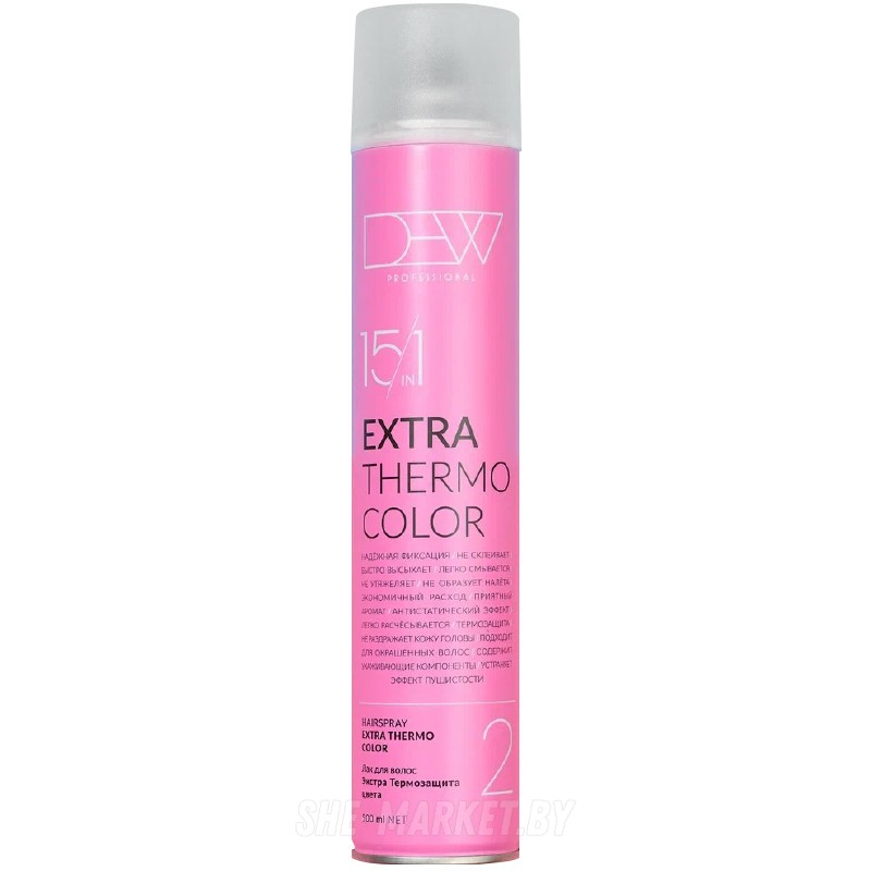 Лак Dew Professional Extra Thermo Color 15 в 1 Экстра Термозащита цвета для волос.Как работает:Лак с термозащитой создан специально для окрашенных волос. Мгновенно фиксирует укладку, сохраняет яркость цвета и защищает волосы от воздействия фена, плойки, утюжка. Обладает сверхсильной степенью фиксации. Не образует налета и легко смывается. Устраняет пушистость и статику. Содержит ухаживающие компоненты.Как использовать:Распыляйте с расстояния 15 см для закрепления отдельных прядей или с расстояния 30 см для завершения укладки. Распыляйте короткими нажатиями.